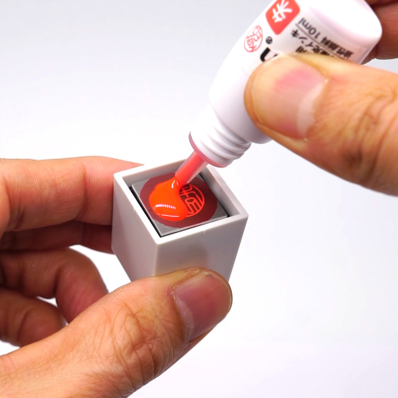 ②キー印が倒れない様に指で支えながらインキを滴下してください。