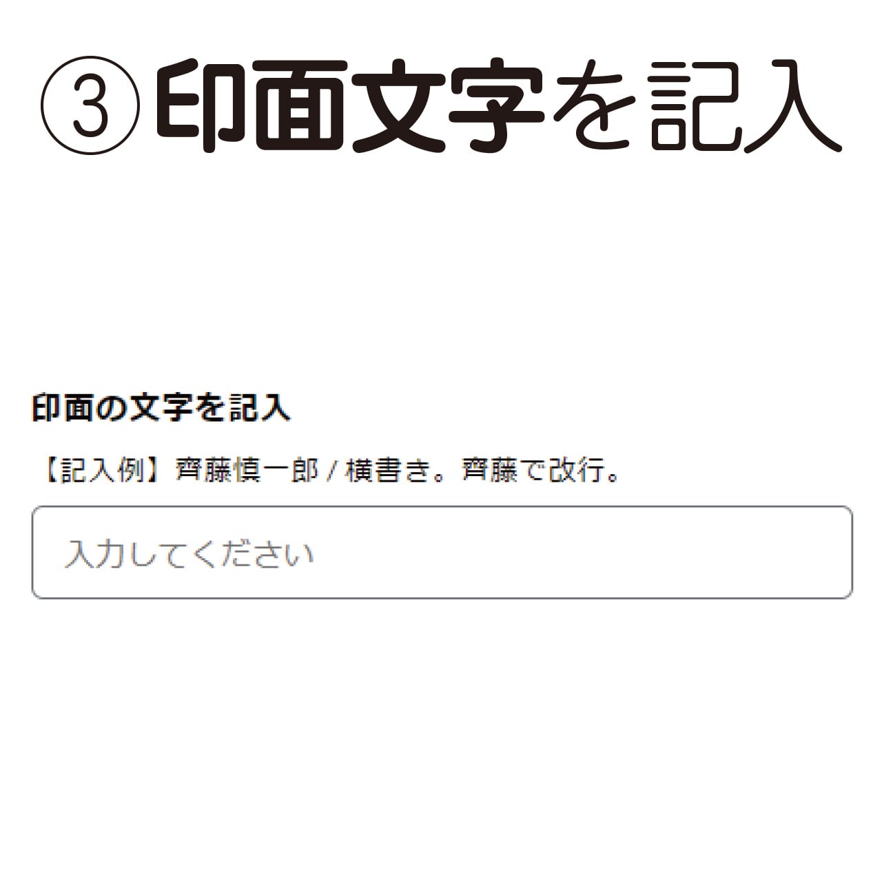 印面の形-サイズ-色/書体/を選び、印面文字※を記入し、カートに入れてください。(※名前など:漢字/ひらがな/カタカナ/アルファベット/!/?で。詳しくは"印面の説明"ページを参考)