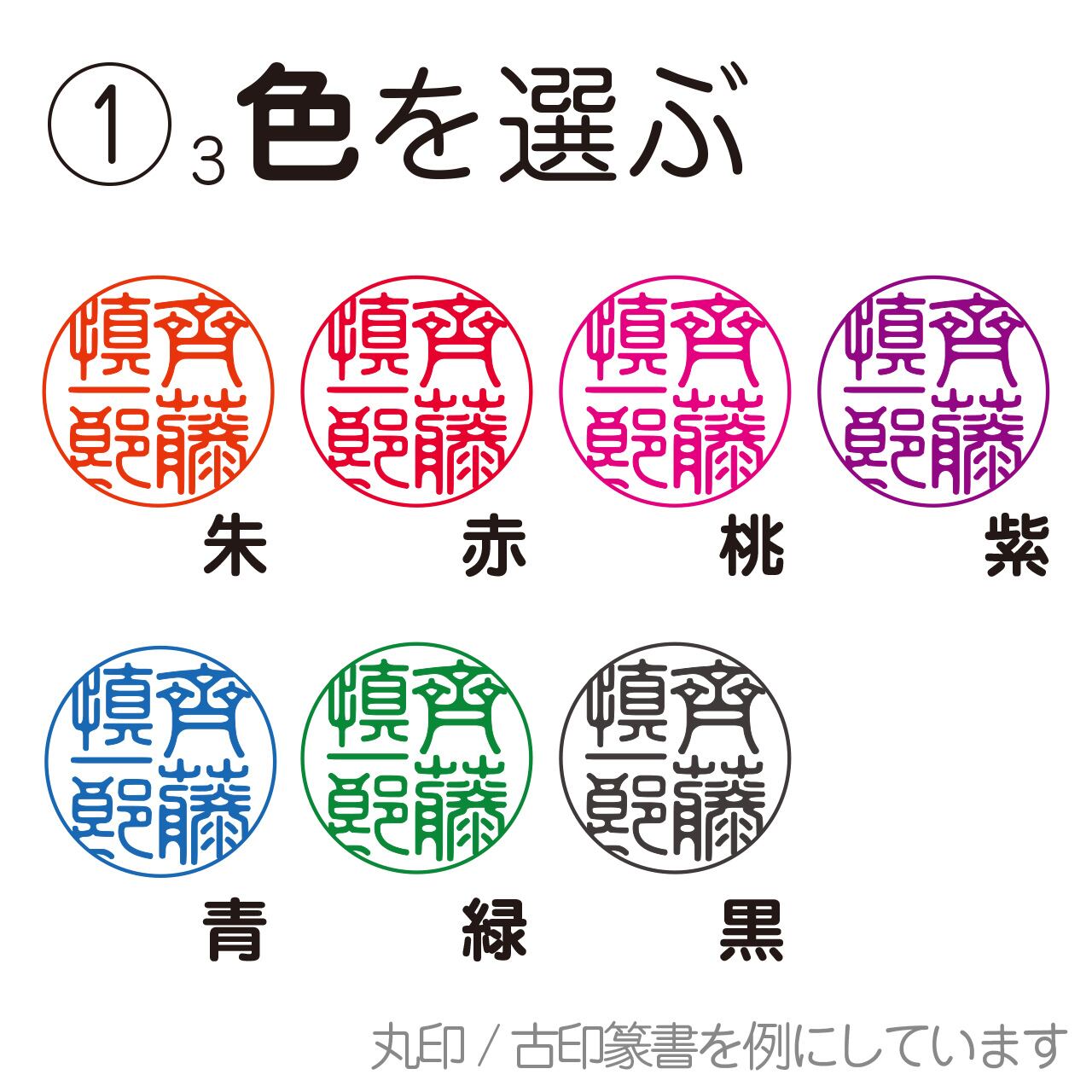 印面の形-サイズ-色/書体/を選び、印面文字※を記入し、カートに入れてください。(※名前など:漢字/ひらがな/カタカナ/アルファベット/!/?で。詳しくは"印面の説明"ページを参考)